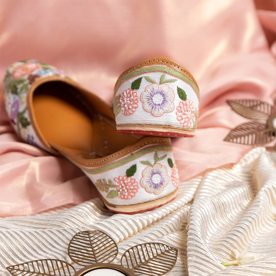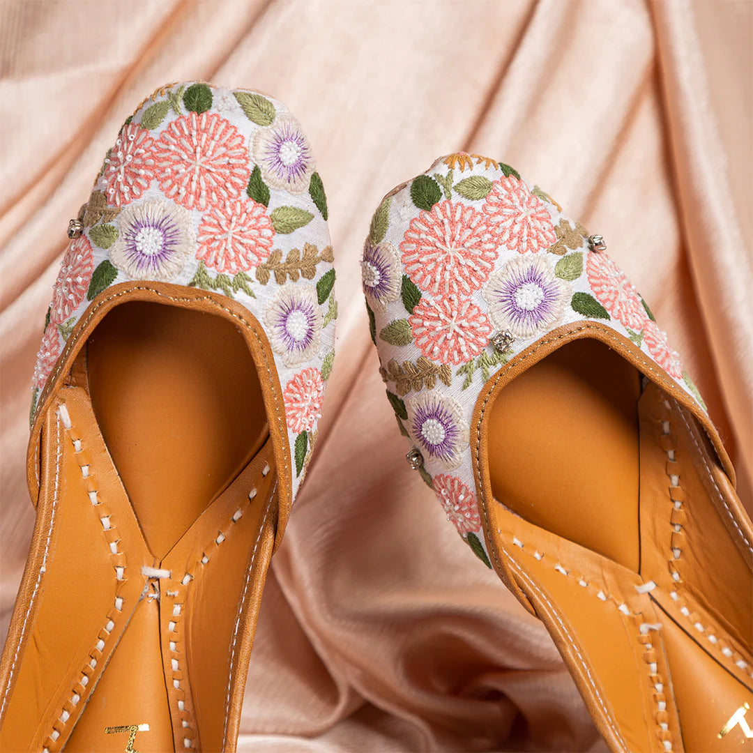 Mahek: A stunning Punjabi jutti crafted with jam cotton fabric. Adorned with vibrant thread work and beads, it's perfect for casual outings, festive celebrations, or even weddings. The comfort, style, and traditional sense of this jutti truly make it worthy of the ‘Khwahish’ collection.